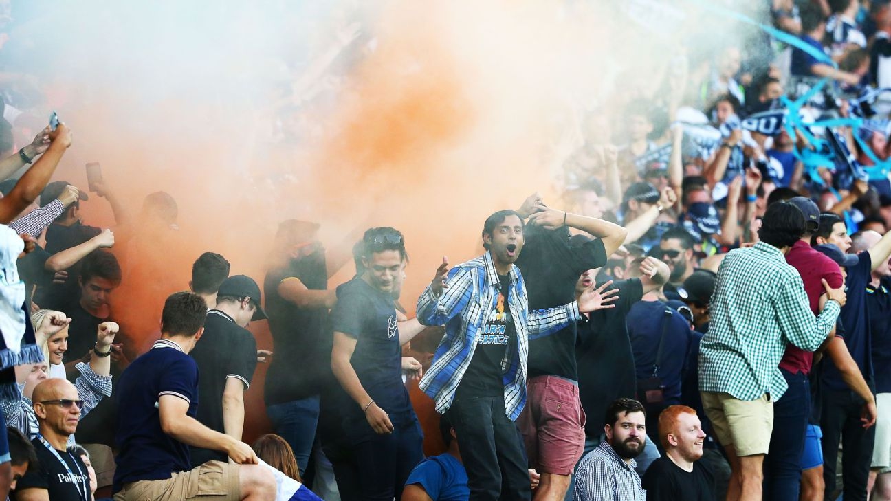 Melbourne victory fans lighting flares and chanting after melbourne derby win.
